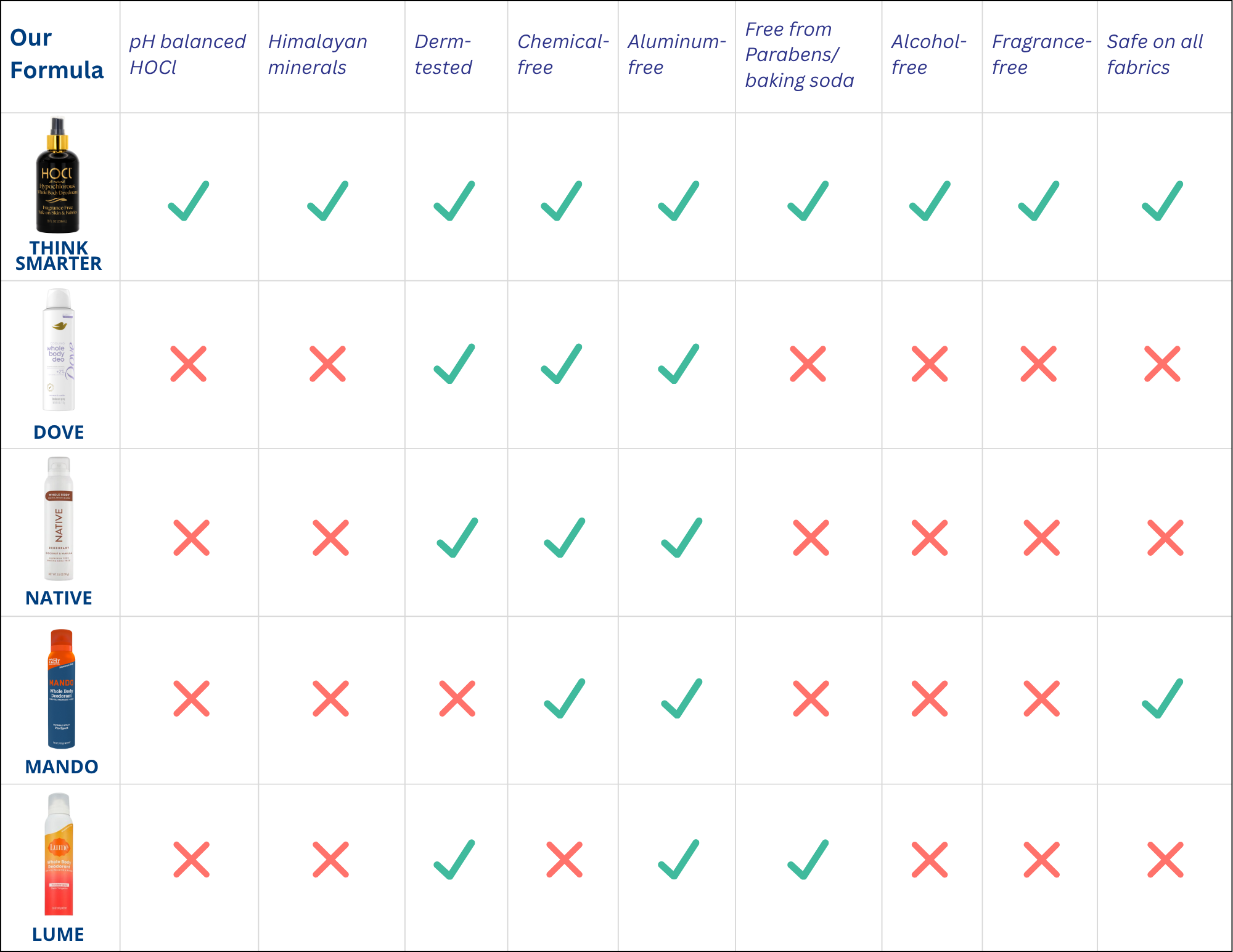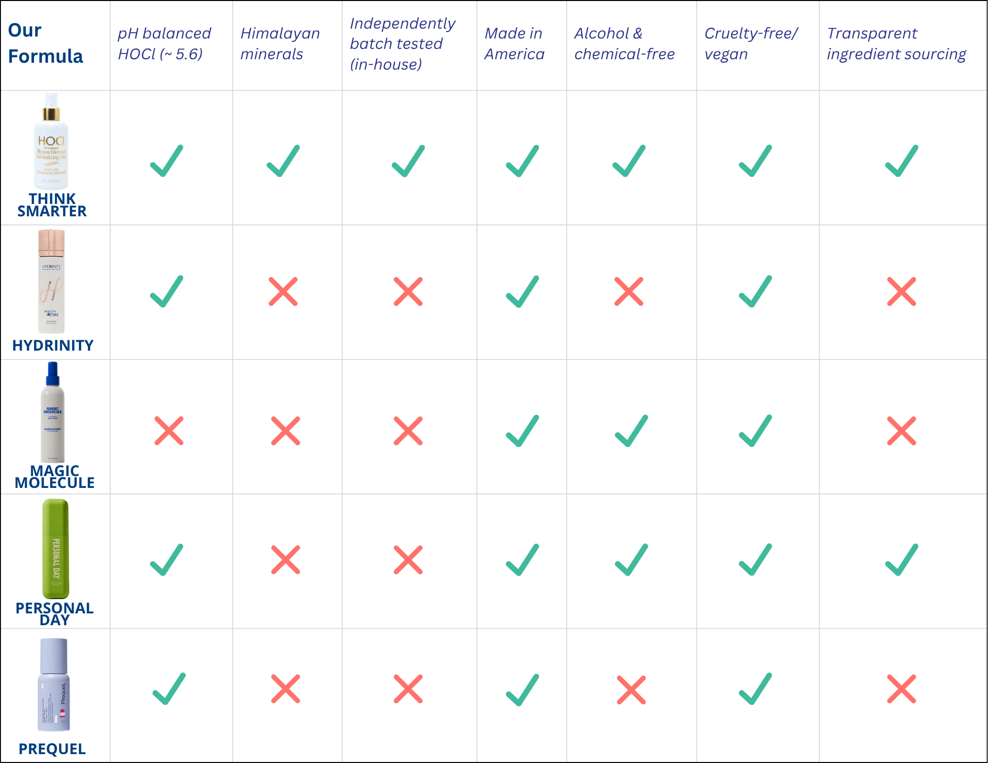 Think Smarter Products is the only hypochlorous-based company that infuses our formulas with Himalayan minerals and tests the pH level of every single batch to ensure purity, balance, and consistent performance. See how we compare to other brands: